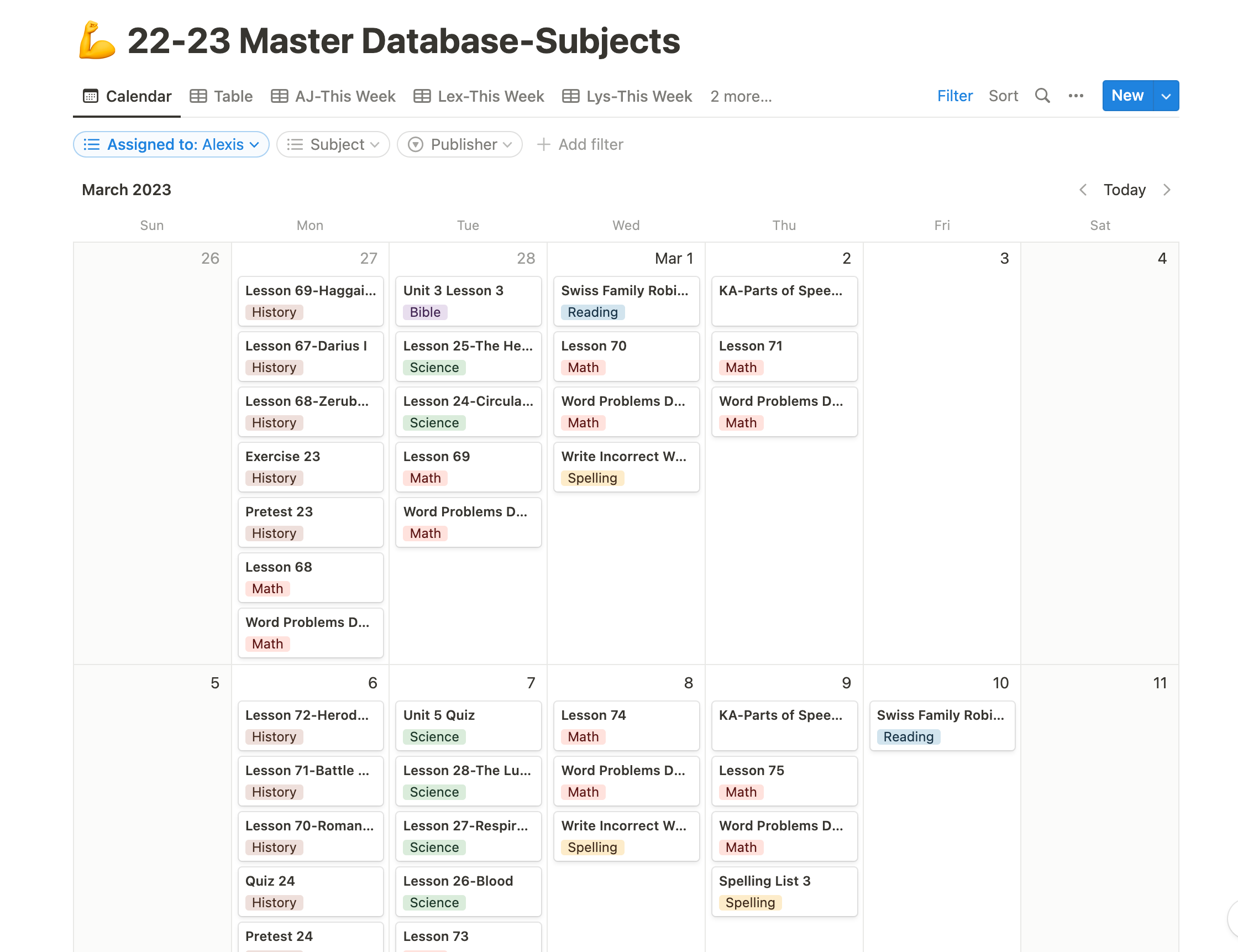 When I started using Notion, I started by going in each week to enter each kids’ assignments into a calendar. All kids are on one calendar because I can FILTER by child, subject, and even curriculum publisher (some of the kids have a couple of different math books). This database I named my “Master Database” because it is from this database that all my other reports and tables come from.