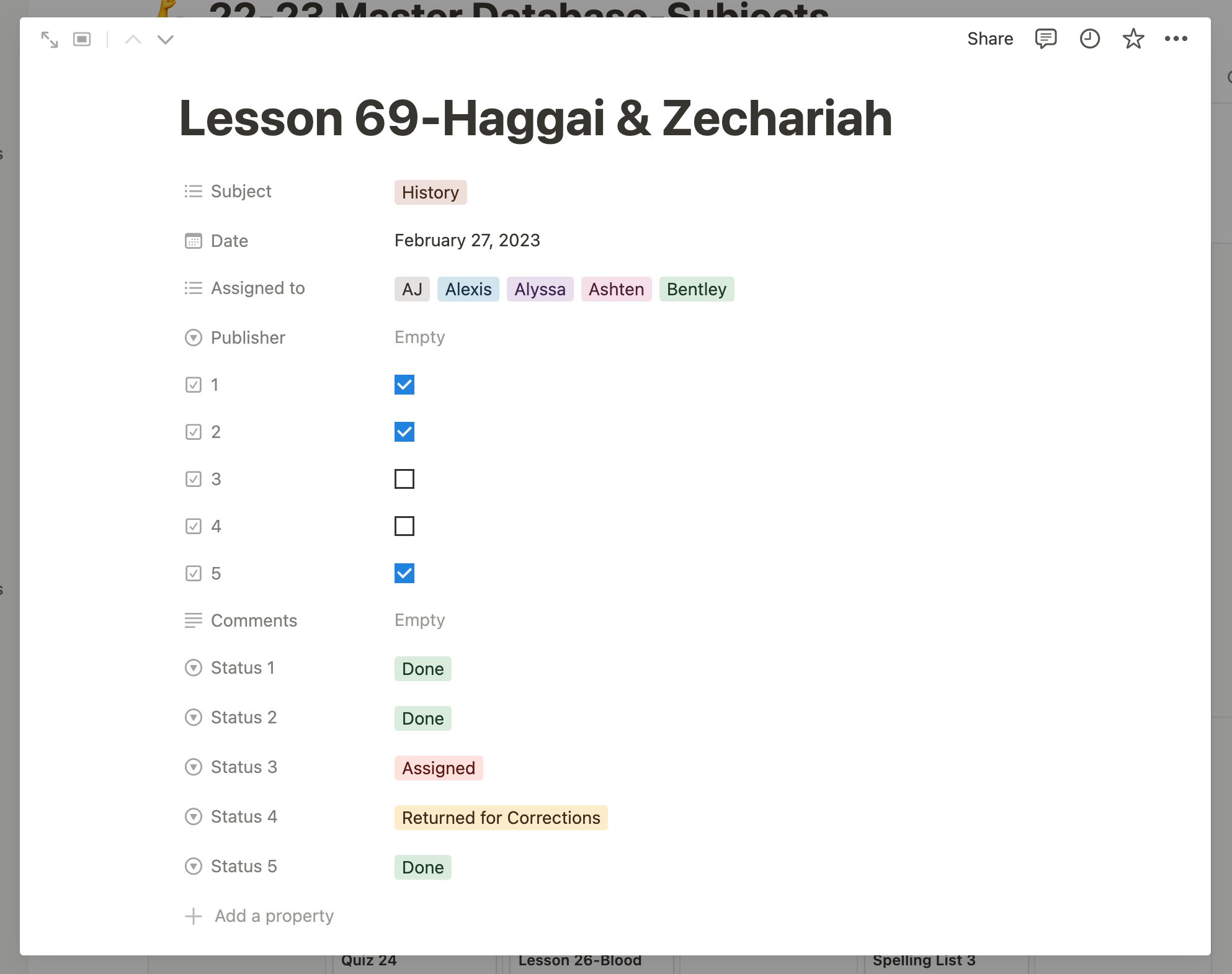 I was having a hard time keeping track of who was finished with what lessons and who was still working on corrections (I have them correct their mistakes after I check their work) and Notion has helped tremendously! I created a “Returned for Corrections” status so that I can easily see who still has a bit of work to do.